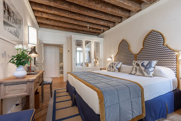 • Das entzückende dritte Doppelzimmer der Wohnung befindet sich in ruhiger Lage im hinteren Teil des Palazzo und ist fachmännisch mit einem Doppelbett* ausgestattet, in wunderschön aufeinander abgestimmten Farbtönen unter einer weiß getünchten Balkendecke und von einem separaten begehbaren Ankleidezimmer profitiert (das mit dem zweiten Schlafzimmer geteilt wird) und ein eigenes luxuriöses Bad mit Badewanne und Dusche