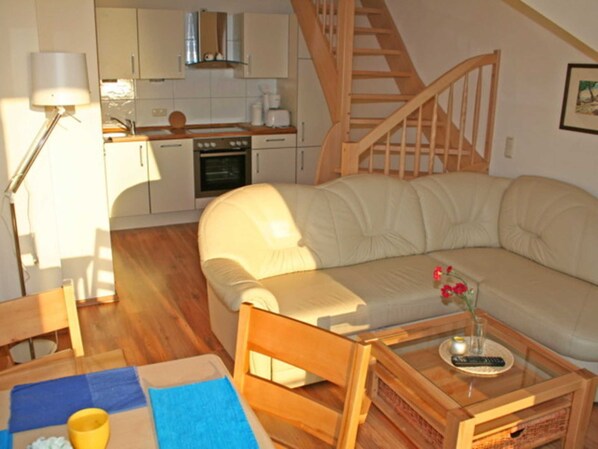 Die modern und individuell ausgestattete 53qm große 3-Raum-Ferienwohnung in Wiek auf der Insel Rügen befindet sich im 2. Obergeschoss im Haus Boddenblick. Der Wohnraum ist geschmackvoll eingerichtet und verfügt über einen Flachbild-TV, einem Lowboard sowie einer ausziehbaren hellen Ledercouch und einem Holzesstisch mit Stühlen. Vom Wohnraum- und Schlafraum ist der Zugang zum großen Balkon gegeben.