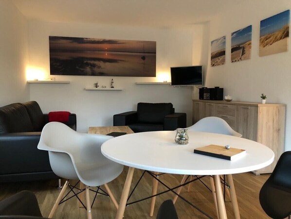 Unsere Ferienwohnung ist eine umgebaute Garage, dementsprechend ist sie seitlich am Wohnhaus angebaut. Die Wohnstube ist fußkalt, zum SZ, Bad und KZ führen kleine Stufen, also nichts für Rollifahrer. Die Terrassentür führt unmittelbar auf den Hof. Bei uns gut, da das Haupthaus nicht vermietet war, somit waren wir allein auf dem Hof. Sonst stehen dort aber mindestens zwei Autos, und man sitzt auf der kleinen Terasse unmittelbar daneben. Leider durften unsere Nachbarn immer mitbekommen wenn bei uns gekocht wurde, da es keinerlei Dunstabzug gab, meldete sich beim kleinsten bisschen der Rauchmelder. Auch gab es einen Fahrradschuppen auf dem Grundstück, dieser war für uns aber nicht zugänglich, die Fahrräder mussten wir am Baum anschließen. Die Küche war sehr spartanisch eingerichtet.Die Wohnung war untenrum sauber, in den Ecken an der Decke krabbelten dann aber doch hier und da paar Spinnchen lang.