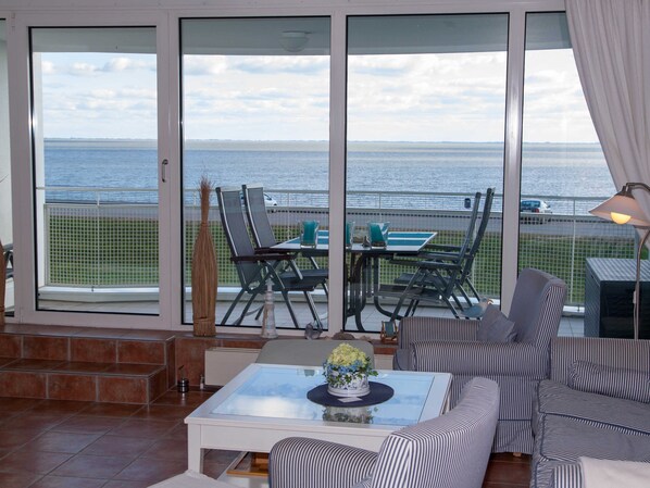 Die Wohnung verfügt über einen großzügigen, hellen Wohnraum, sehr geschmackvoll möbliert, mit Flat-TV, CD- und DVD Player, einen charmanten Essbereich mit integrierter, hochwertig ausgestatteter Küche ( Geschirrspüler, Backofen, Mikrowelle, Kaffeemaschine, Tassimo, Wasserkocher etc. ) und einem großen Südbalkon mit einer bequemen Sitzgarnitur zum Verweilen zwischen den Wassern. Auch Gesellschaftsspiele sowie diverse Bücher zur freien Verfügung hält diese Wohnung für Sie bereit.