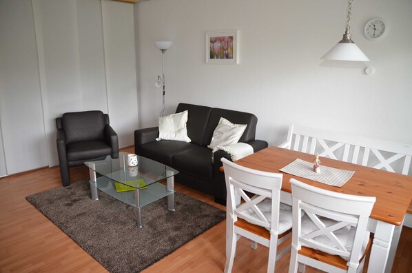 Die Wohnungen verfügen entweder über einen Balkon oder eine Terrasse mit Strandkorb. Die Ferienwohnungen bieten auf ca. 46qm Platz für 2 Erwachsene und 1-2 (Klein)-Kinder. Da sich in einigen Wohnungen im Kinderzimmer ein Einzelbett befindet, eignet sich diese Wohnung auch für Erwachsene, die getrennt schlafen möchten. Die Ferienwohnung unterteilt sich in Küche, Flur, Duschbad, Kinderzimmer mit Einzelbett oder Etagenbett (Zustellmöglichkeit Babybett vorhanden) und ein großes Wohn-Schlafzimmer.