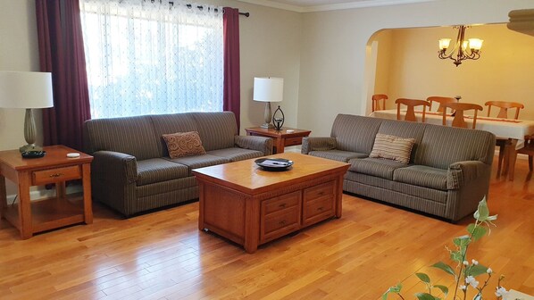Le rez-de-chaussée comprend une cuisine gastronomique avec un coin recoin donnant sur la grande cour arrière clôturée. La cuisine gastronomique est entièrement équipée avec tous les ustensiles de cuisine, vaisselle, ustensiles de cuisine, verrerie, épices et cafetière nécessaires pour préparer un repas maison. Le salon a de beaux planchers de bois franc avec des baies vitrées avec des baies vitrées dans la salle à manger formelle. Le salon dispose d'un coin salon avec de confortables canapés-lits. Le salon dispose de nombreux sièges pour se détendre et se détendre tout en profitant de la cheminée ou regarder des films sur la télévision connectée de 55 pouces avec lecteur Blue Ray ou en streaming via notre connexion Wi-Fi gratuite. Il y a deux chambres à l'étage principal et une salle de bain complète avec double lavabo, combo baignoire / douche avec douche verticale supplémentaire. Grande buanderie qui comprend les fournitures de blanchisserie de base, fer et planche à repasser, si vous le souhaitez. Le garage a un ouvre-porte de garage est accessible directement hors de la salle de lavage.