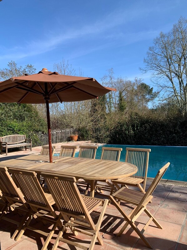 À l’extérieur, un véritable espace de détente vous attend : piscine à débordement de 13 x 7 m (ouverte de mai à octobre), boulodrome, terrain de tennis privé et petite rivière traversant la propriété. Tout est réuni pour profiter pleinement de la nature et du calme environnant.