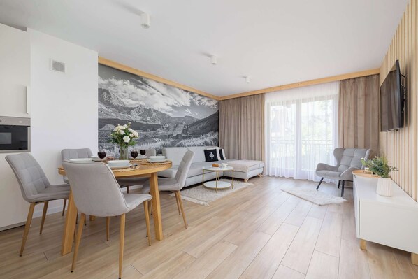 Wir laden Sie ein, ein komfortables 50 m² großes Appartement zu buchen, ideal für 5 Personen! Das moderne Interieur mit einem gemütlichen Hochland-Akzent schafft eine einzigartige Atmosphäre, die zum Entspannen einlädt. Es gibt eine voll ausgestattete Küchenzeile, kostenloses WLAN, Smart-TV und einen geräumigen Balkon mit malerischer Aussicht - perfekt für den Morgenkaffee oder die abendliche Entspannung. Ein Privatparkplatz in der Garage ist ein zusätzlicher Bonus. Eine Rechnung mit Mehrwertsteuer ist auf Anfrage erhältlich.