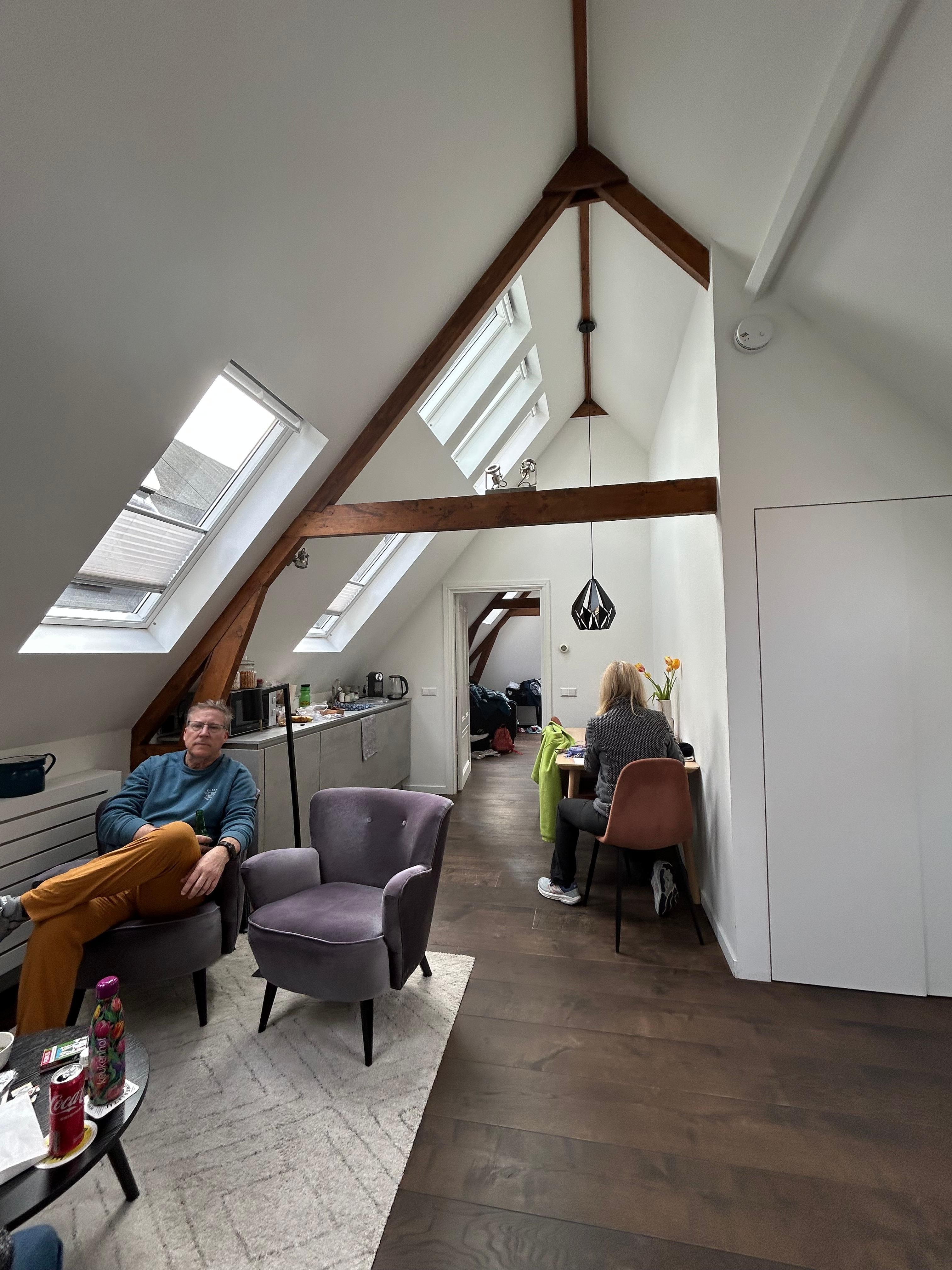 Il est situé au quatrième étage d'un immeuble classique d'Amsterdam du XIXe siècle, avec ses escaliers étroits typiques. L'emplacement est idéal. Il se trouve à seulement deux minutes à pied de toutes sortes d'arrêts de tramway et de bus. Et le bus direct de Schiphol arrive également ici.