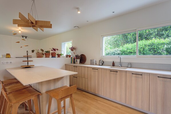 - une cuisine ouverte avec un ilot central, parfaitement équipée (Barbecue, Machine à café, Grille-pain, Bouilloire, Four, Four micro-ondes, Plaques de cuisson, Lave-vaisselle, Réfrigérateur),