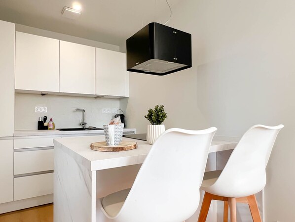 Une cuisine équipée (lave-vaisselle, plaques induction, four, machine à café Nespresso)