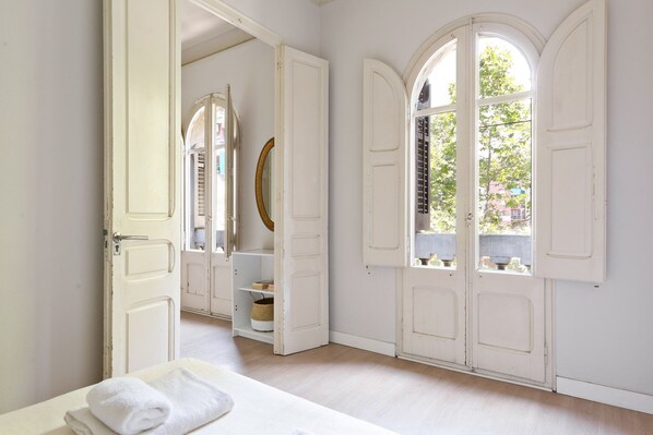 Cet appartement dispose de trois chambres confortables et deux salles de bains, un espace idéal pour des groupes allant jusqu’à six personnes. Avec approximativement 100m2 d’espace, généreux selon les standards de Barcelone, l’appartement vous assurera assez de pièces pour vous relaxer et profiter de votre séjour. La salle à manger et le salon, situé à l’arrière du bâtiment, incluent une grande table à manger et un canapé confortable, offrant un espace accueillant pour se rassembler et partager un moment tous ensemble.