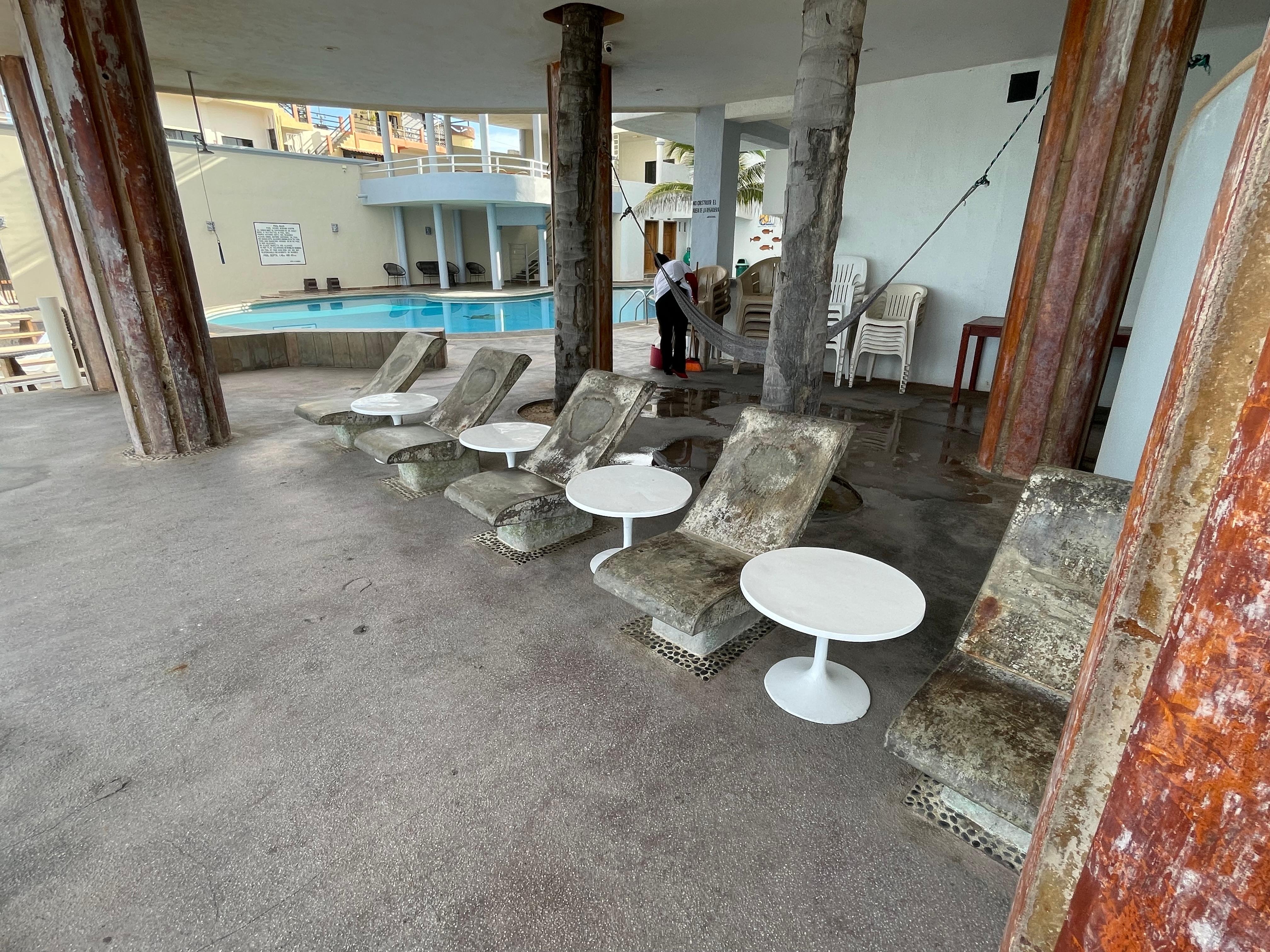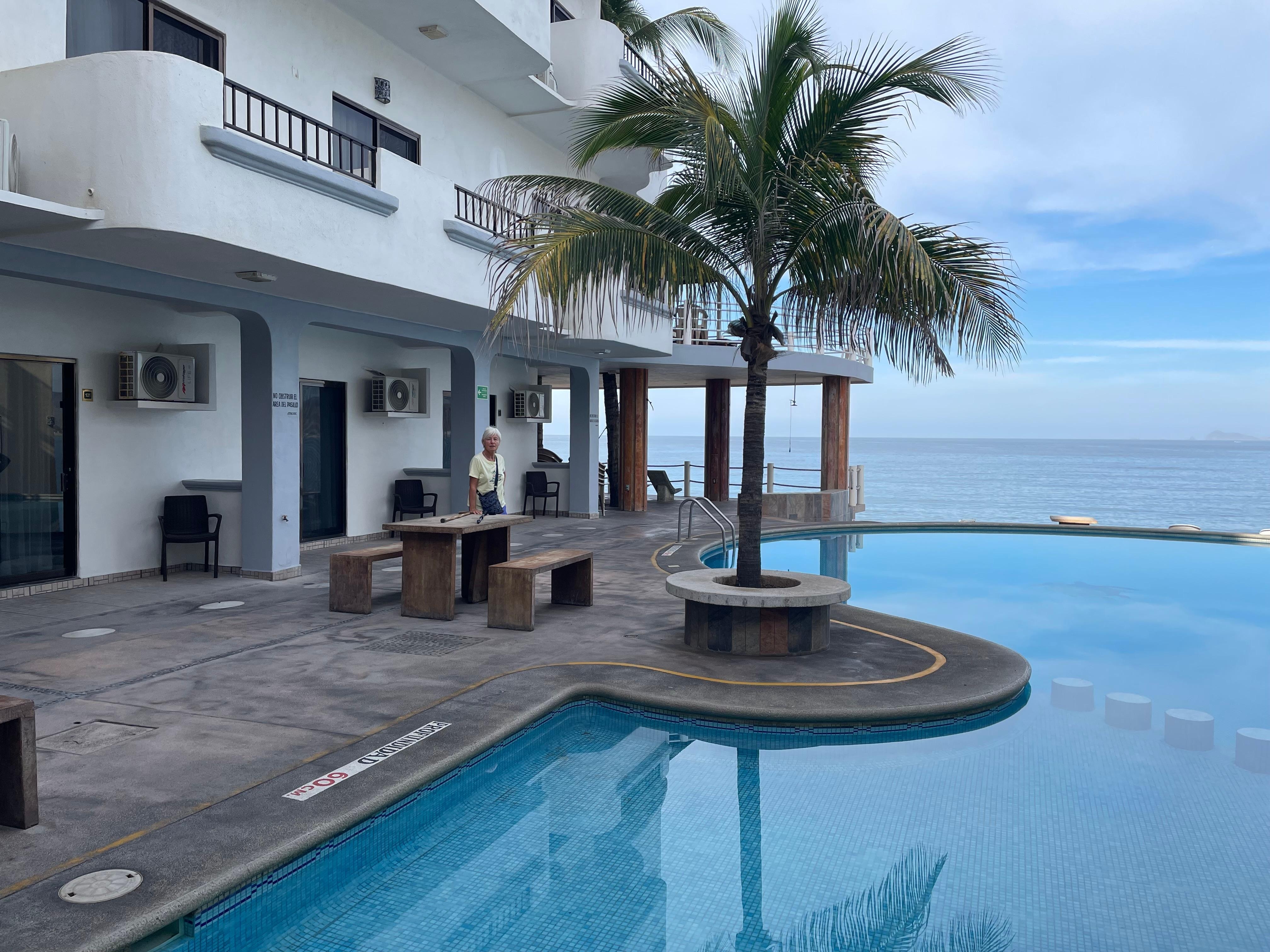 Piscine situé dans un autre building en face, manque de meuble pour déposer effet et valise.