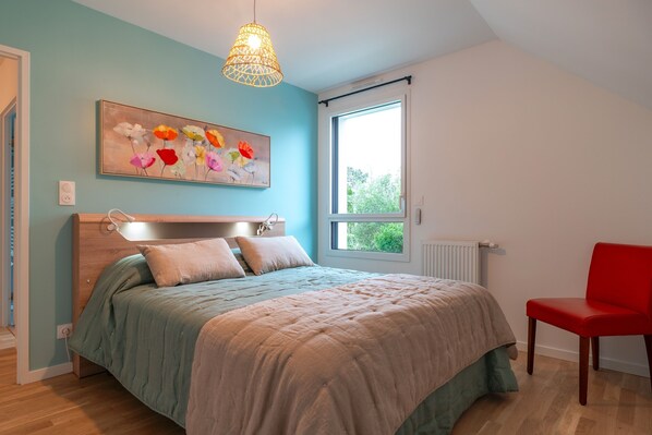 - Chambre 1 : suite parentale avec un lit king-size (180×200), placard et une salle d'eau attenante avec douche et deux lavabos