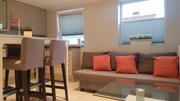 Profitez de votre séjour à Bergen dans notre appartement joliment rénové situé dans un quartier calme et vénérable. L'appartement est situé à Danmarksplass et dispose de bons transports en commun vers le centre-ville. Ou vous pouvez choisir de marcher environ 2,5 km du centre-ville. L'appartement comprend une chambre, une grande salle de bains et un espace commun spacieux avec une cuisine entièrement équipée et un charmant salon.