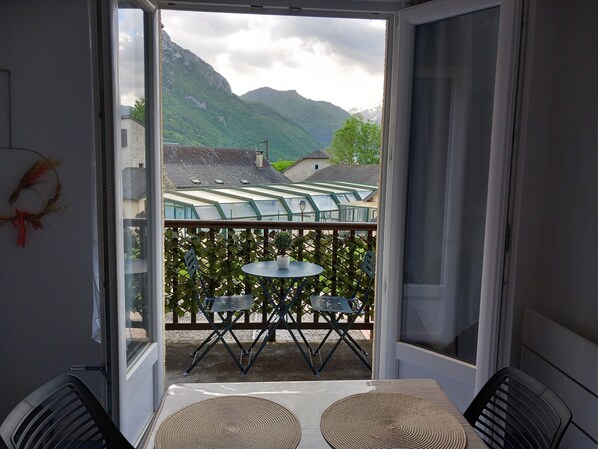 Balcon, cafetière/bouilloire et chauffage