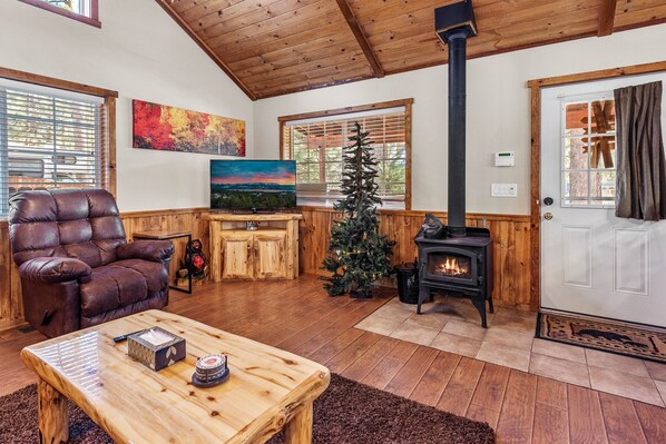 The cabin was well appointed, two bedrooms that had bathrooms attached (which were also accessible from the hall. The furniture was comfortable and the kitchen clean and stocked. There were travel toiletries provided and even a small package of coffee, but no filters. We improvised and used a paper towel, but we bought some filters and left them there. In the room with the king size bed there was only one nightstand and the other side was pushed up against the wall, so I had to crawl in and out. I was still happy to have the king size, since many places only offer queens.We didn't use the hot tub, which was relatively private and only exposed to neighbors on one side.The location was close to the tubing and roller coaster park, as well as a short drive to the Village.