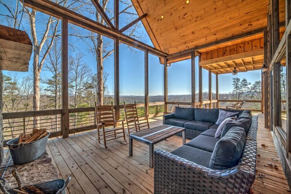 Extérieur - véranda avant couverte; terrasse couverte au niveau principal, 2 foyers au bois en pierre, TVHD à écran plat de 65 ", grand canapé sectionnel en osier, table basse, 2 bascules, sièges de table à manger 6, barbecue à gaz; pont inférieur, sièges de spa 7, canapé, 2 chaises, table basse; foyer, 4 places