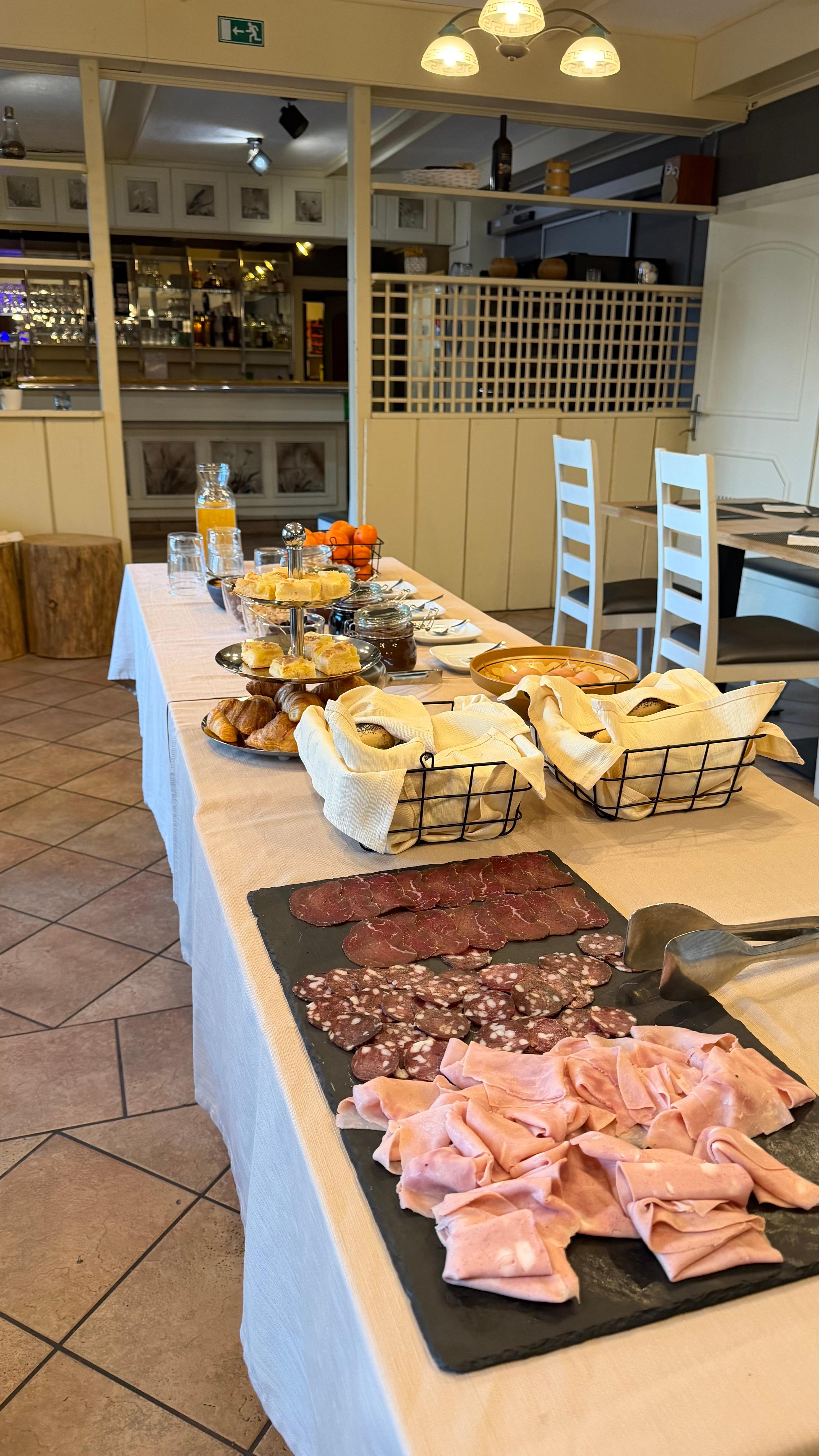 Breakfast was served as a buffet with a great selection of ham, cheese, and fresh fruit, even though there were only two groups staying. Coffee and fried eggs were prepared upon request.