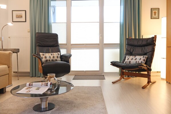 Das insgesamt hochwertig ausgestattete Apartment mit Terrasse in Süd Richtung, auf der sich während der Saison ein Strandkorb sowie weitere Möblierung befinden, ist für 2 Personen buchbar und verfügt über eine gut aufgeteilte Wohnfläche von 55qm. Sehr geschmackvoll empfängt Sie das helle Wohnzimmer mit einem bequemen Sofa, Ruhe-/Lesesessel, Schrankwand, Flachbild -Fernseher, DVD, Musikanlage, Esstisch mit 4 Sitzplätzen. Kostenfrei können sie den Internetzugang über WLAN nutzen. Die Küche befindet sich separat und ist komfortabel ausgestattet mit Cerankochfeld, Backofen, Mikrowelle, Geschirrspüler, Kaffeemaschine, Toaster, Wasserkocher ausreichend Geschirr, Töpfe u.s.w.