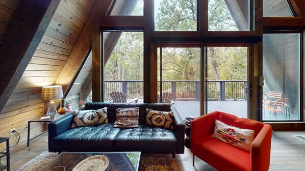 Innerhalb des PFEILHAUSES sind die Gäste in einem zweistöckigen Raum umhüllt, der absichtlich und buchstäblich von innen gebaut wurde, was versichert war, dass Ihr Auge von nichts als 100% organischer Schönheit umgeben war. Die Innenwände, Böden und Deckeneinlagen sind massiv (lokal angebaut) Kiefer, mit massiven 4 "Ruff geschnittenen Zedernbalken und Traversen, die die Decke verleihen, um das perfekte" A "zu schaffen. Getreu dem Zweck für A-Frame-Ferienhäuser, sitzt ein moderner schwarzer Gusseisen-Holzofen im Wohnzimmer, der sowohl Funktion als auch eine skulpturale Schönheit dem Raum hinzufügt. Das offene Esszimmer und die Küche bieten ausreichend Platz für 8 Personen. Innerhalb der Küche wurden benutzerdefinierte Schränke und Edelstahl-Geräte gezielt platziert, um offene Regale zwischen den massiven Zedernbalken zu ermöglichen, sowohl ein Anbieter von Lagerung und Kunst zu sein. Die beiden Geschichten aus Glas wurden entworfen, um Ihnen einen atemberaubenden Baum Draufsicht von allen drei dieser offenen Räume sowie der Dachboden oben zu geben. Von den Schiebetüren sind Sie in einer visuellen Erhebung, die eine längliche malerische Ansicht von Mutter Natur die absolute Schönheit auf PFEIL HAUS-weitläufigen Deck bietet. Vom Wohnbereich aus können Sie in einen geräumigen, offenen Schlafboden hinaufsteigen, der Ihnen einen großen Platz zum Schlafen, Lesen, Extragastviertel oder Meditation bietet. Diese zweite Etage Loft-Raum bietet volle Front-und Rück-Optik durch die Außenwände aus Glas, sowie eine im Obergeschoss überdachten Balkon, die Ihnen einen zusätzlichen Blick auf den Wald und das Eigentum.