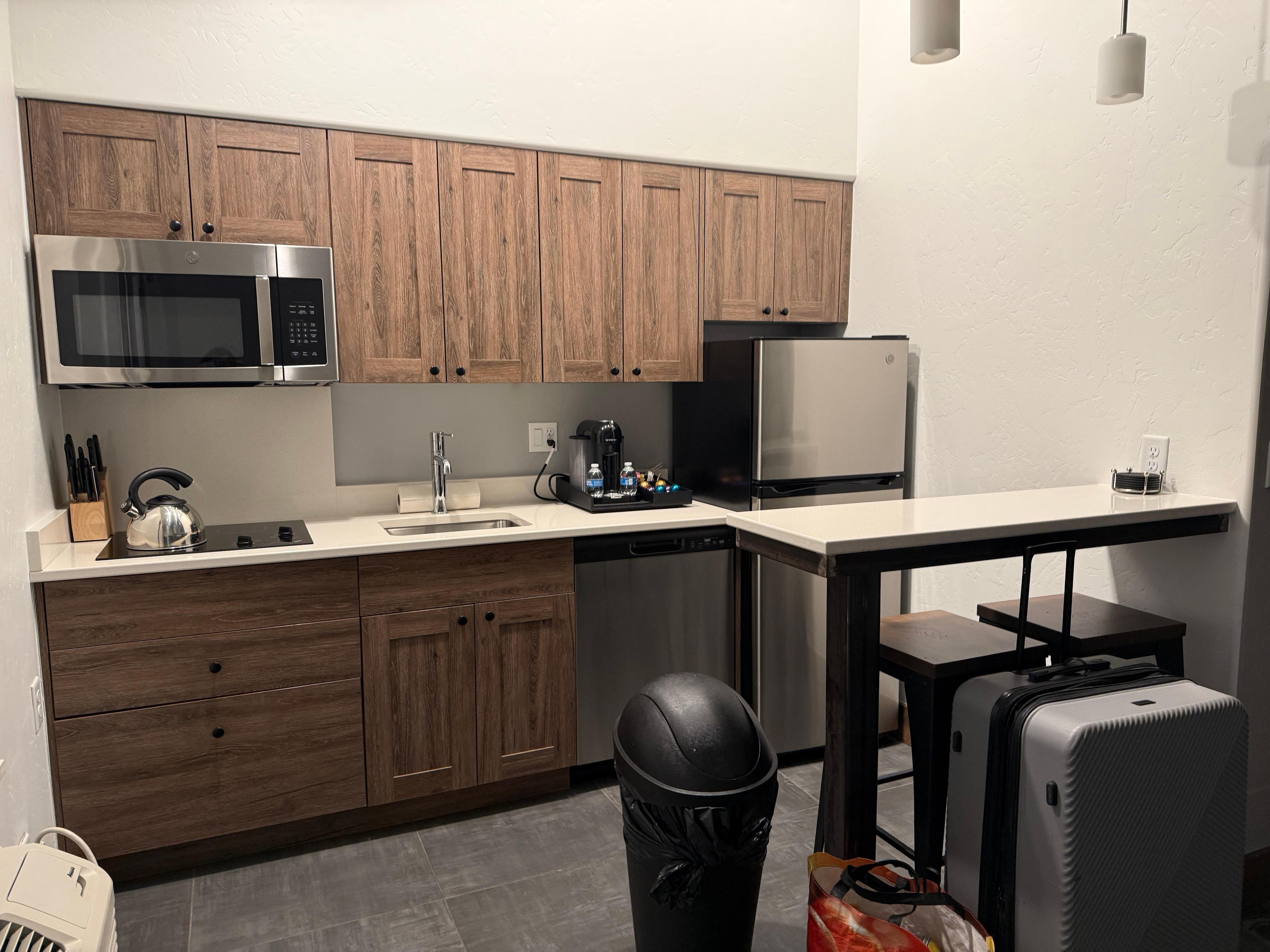 Stayed in the Creekside for 1 night. The room has a little kitchen with free coffee espresso machine, fridge, microwave and a little stove with kennel and kitchen stuff. Room was clean. Although the beds weren’t comfortable, especially the pillows are extremely hard. The light outside in the hallway was very bright and the door is the foggy kind so it didn’t block the light at all. I couldn’t sleep at night because of the brightness from the light in the hallway shining through the door like the sun.