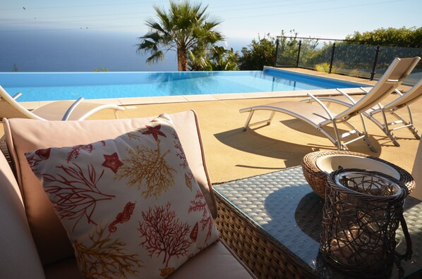 Piscine extérieure, piscine à débordement, chaises longues