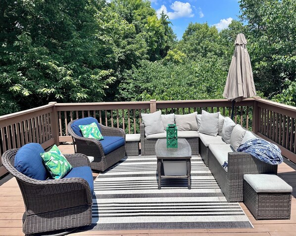 Nestled by the 7th green, large deck areas. Movie theatre for inside or out.