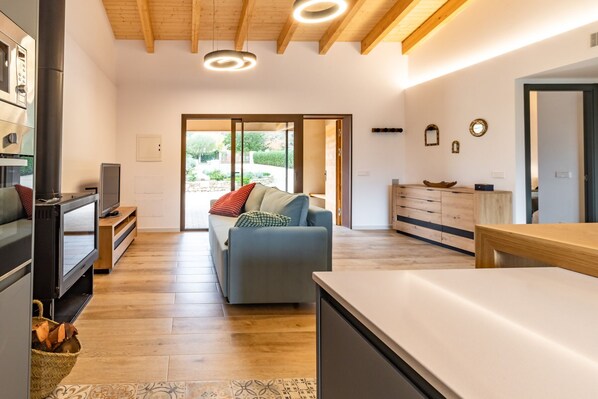 L ’entrée principale de la maison se trouve sur le porche couvert. En entrant, on découvre un espace ouvert très spacieux et baigné de lumière naturelle, grâce aux grandes baies vitrées qui donnent sur l’extérieur. Dans cet espace, on trouve une zone de détente, équipée d’un canapé-lit double, d’une télévision, d’une cheminée avec bois de chauffage et d’un mobilier chaleureux. La cuisine ouverte, entièrement équipée, avec une table à manger et des chaises, ainsi qu’un accès direct à la terrasse extérieure.