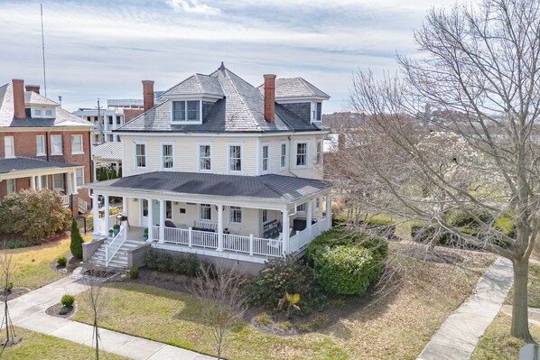 sharing beds, so it works best for couples and 2 kids on the twins. We were 3 women all related to each other, and 4 kids from one family, so we doubled up as mother and child, grandmother and child, one adult in one of the queen rooms, and 2 kids on the twins. The kitchen is very well equipped, modern and clean appliances, older but charming cabinets and counters. One full bath modernized, and one full bath with lots of room for your toiletry items and a freestanding tub with old fashioned shower attached with shower curtain. Half bath downstairs. Lots of lamps and comfy furniture, including bed mattresses and linens. House is large and spacious and really lovely. Best part…..one block to the beach and one block to Mason Ave, the Main Street and downtown area. The location cannot be beat. Corner lot and neighbors only on one side. Property manager Kathy was very responsive, and helpful. I hope to rent this house again, and I highly recommend it!