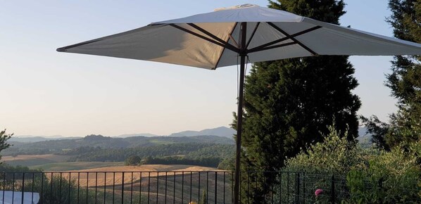 L'espace extérieur privé, avec vue sur la campagne, est équipé d'une table et de chaises pour d'agréables repas en plein air. Du petit jardin, un escalier mène à la place de parking réservée.