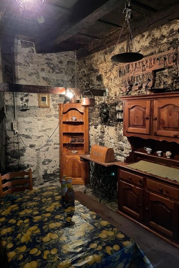 Inside, the farmhouse boasts a cosy living area furnished with a reclining relaxation armchair, a leather sofa with liftable seats, a 32-inch Philips television and a charming stone fireplace, perfect for relaxing evenings in front of the fire. The dining room, equipped with a table and four chairs, offers an ideal setting for breakfast, lunch and dinner with friends. The bedroom proves to be a comfortable space thanks to the large wardrobes, bedside tables with drawers and a television with Bluetooth connection. The kitchen is fully equipped with modern appliances such as a water gas maker, a fireplace grill and various fondue and raclette utensils, ensuring a complete dining experience.