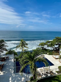Hotel in Strandlage mit 2 Außenpools und einem schwarzen Sandstrand
