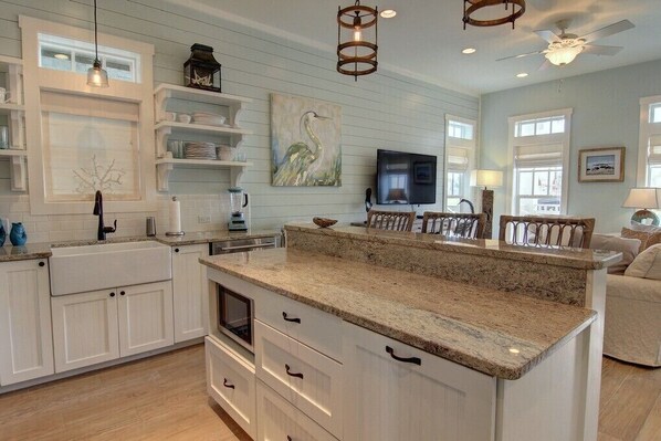 Ouvrez la porte d'entrée de l'espace de vie principal en bas, où vous pourrez vous détendre en famille et entre amis. Un mélange de chaises de salle à manger en bois et de fauteuils rembourrés à accoudoirs entourent la grande table à manger, pour les repas et le jeu. Cette zone se jette dans le salon principal, avec des sièges confortables et un écran plat, monté sur le mur, au-dessus d'une console ornée de pièces d'accent Beachy. La cuisine entièrement équipée soutient cet espace de vie tout-en-un, avec du rotin, des sièges de tabouret de bar sur l'île et des étagères ouvertes.