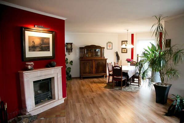 L'appartement est équipé selon ce nombre de personnes avec des plats et d'autres ustensiles. La cheminée donne du confort. Dans les autres appartements est alors beaucoup de place pour les dormeurs. Comme il n'y a pas de salon commun ou de salle de petit déjeuner dans la propriété, il serait pratique que les clients prennent en charge leur propre petit-déjeuner. Dans les cuisines entièrement équipées, on trouve toujours du café, du thé, du lait condensé et de la confiture maison. Volontiers je reprends après consultation un service de courses correspondant, pour fournir des choses manquantes selon vos souhaits.