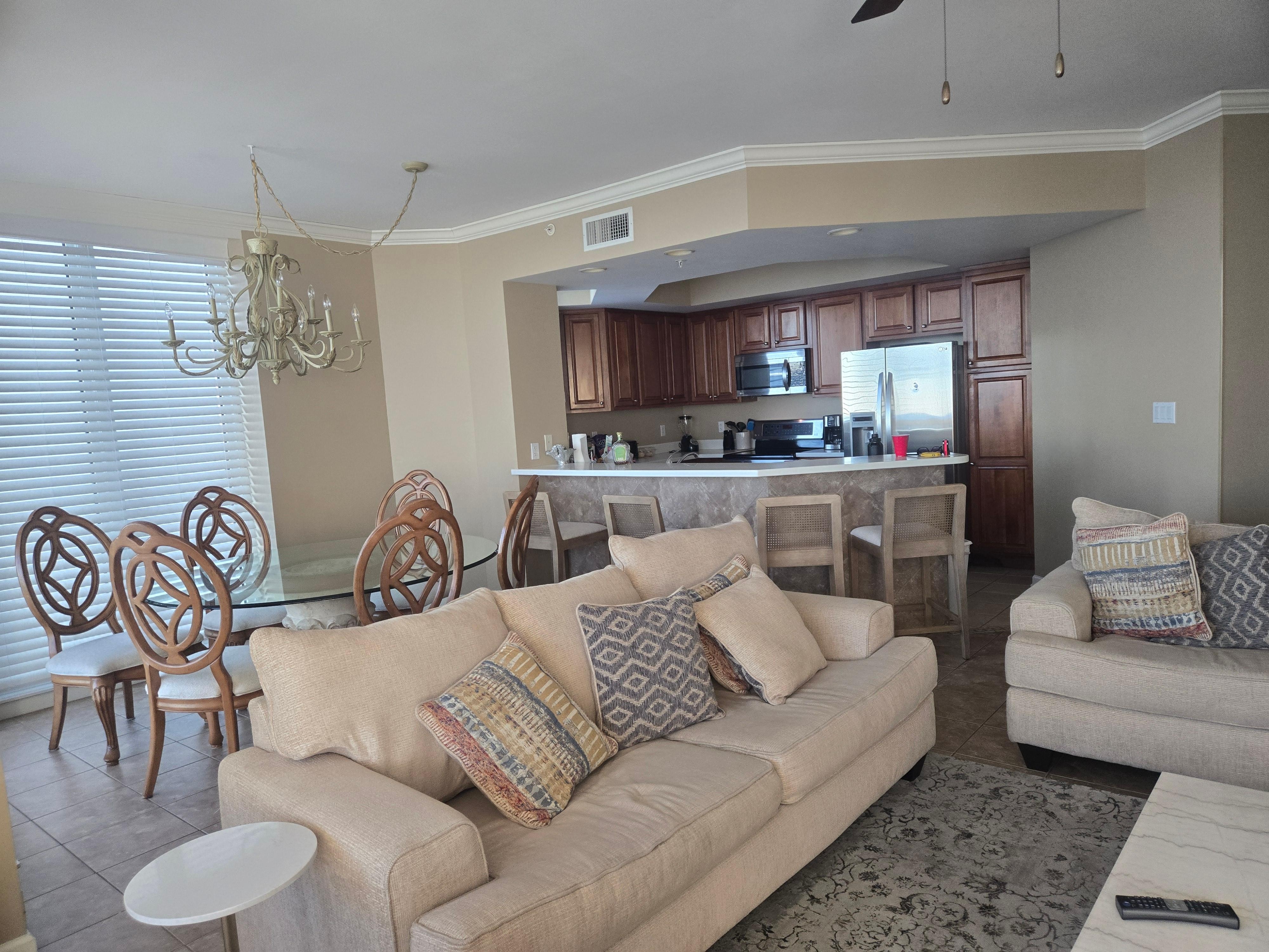 Cette copropriété est bien aménagée avec un salon confortable. La salle à manger et le bar du petit-déjeuner sont adjacents au salon avec suffisamment de sièges pour tout le monde dans votre groupe. La cuisine entièrement équipée contient des appareils en acier inoxydable et un poêle à dessus plat. Le placard de buanderie est dans le hall principal et contient un ensemble de laveuse et sécheuse pleine grandeur.