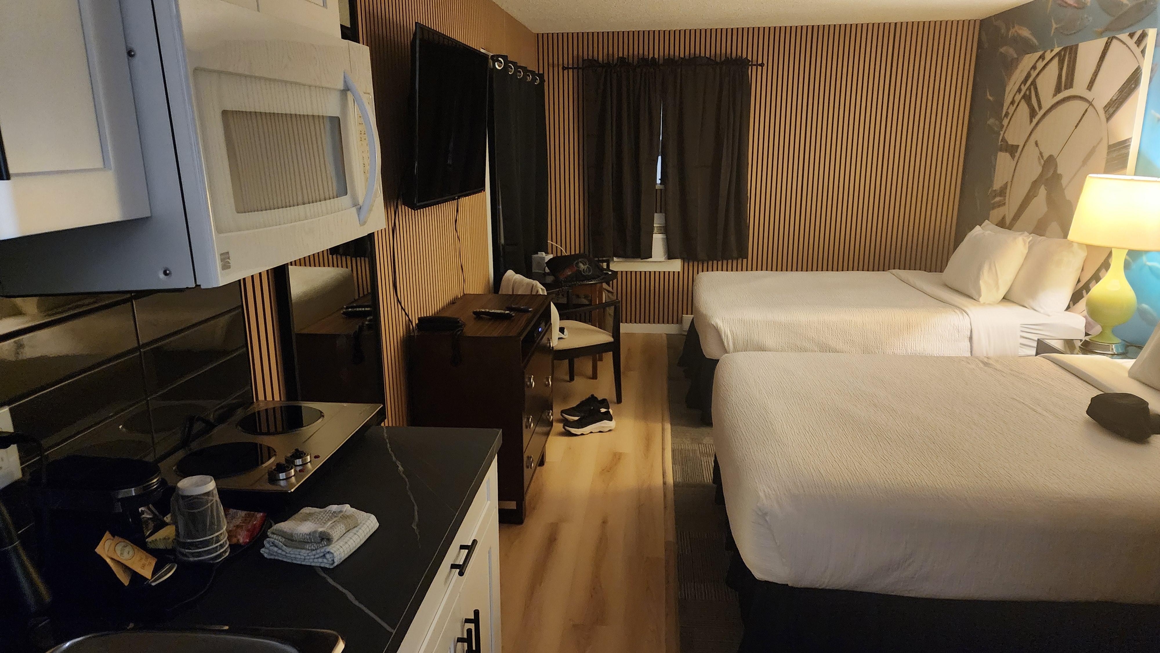 Rooms have been renovated and were pretty nice. Our room had a kitchenette and it only had a small frying pan and small pot nothing big enough for two people barely even big enough for one but other then that everything was good. Owner was super friendly and made sure we had one of the better rooms which was nice, I asked for a room on the bottom and some cuterly and he was able to provide that for us so they are accommodating. There is a decent sized parking lot in the back, room was clean, prices are fair. Our stay overall was good and I would probably go back if needed.