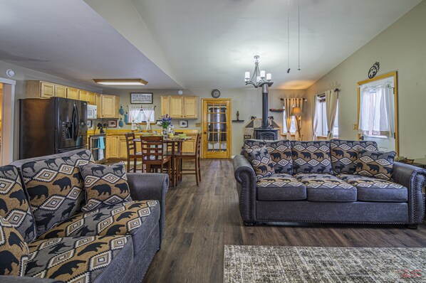 Red Bear Den a une sensation de cabane en rondins avec des équipements modernes confortables. Décorée avec des œuvres d'art et des meubles de l'Alaska local, cette belle maison vous donnera un avant-goût de l'Alaska que vous recherchez, avec l'avantage de la plomberie intérieure. À 1300 pieds carrés, cette maison peut accueillir 6 adultes avec 3 chambres et un canapé-lit. Il y a deux salles de bain et une buanderie avec accès à une laveuse et sécheuse pendant votre séjour. La cuisine est équipée d'un réfrigérateur, d'une cuisinière double, d'un lave-vaisselle, d'un Keurig et des éléments essentiels de cuisine fournis. Si vous cherchez une maison familiale, c'est tout! Un Pack and play, une chaise haute et une poussette sont disponibles (à louer?). Câble satellite, lecteur DVD et Internet sans fil haute vitesse sont également disponibles pour l'utilisation et le divertissement.