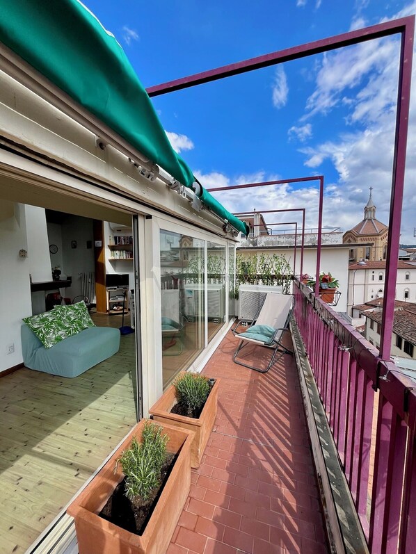 WOHNZIMMER: Zwei große Schiebefenster, die von drei großen Oberlichtern beleuchtet werden, ermöglichen den Zugang zur bewohnbaren Terrasse mit Tisch und Stühlen, von der aus Sie den herrlichen Blick auf Florenz und die Kathedrale genießen können.
