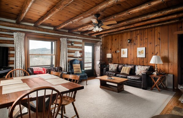 Profitez d'une vue spectaculaire sur la rivière Shenandoah Valley et de la pierre couverte porche. Cet authentique cabane pittoresque permet pour la quiétude des montagnes ou d'une base de départ pour une variété d'activités à la fois locale et à proximité. Une salle familiale spacieuse avec lit queen déplier canapé-lit et une télévision avec lecteur DVD, deux chambres avec chacune un lit double et une salle de bain complète font de cette cabine une escapade parfaite pour un maximum de six personnes. Il ya une cuisine entièrement équipée avec four micro-ondes, cafetière, grille-pain four, et lave-vaisselle. La cabine dispose d'un chauffage central et climatisation pour location possibilités multi-saison. Un barbecue en pierre et pique-nique table en plein air sont situés sur une terrasse à l'arrière de la cabine. Un sentier court conduit à des marches de pierre qui vous emmènent au bord de la rivière pour la baignade, la pêche ou tout simplement tremper vos orteils. Notre propriété n'a pas accès en bateau directement, mais il y a un bateau public atterrissage à moins de 2 miles.