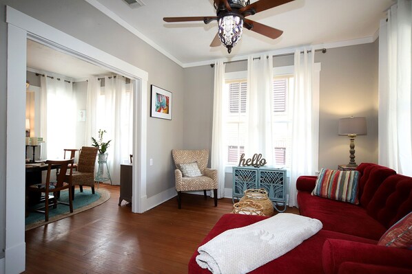 Although we were a group of three adults, the property could comfortably accommodate up to seven or eight individuals, with the option of utilizing the futon for additional sleeping space. It's worth noting that the layout may be more suitable for close family members, as the single bathroom is situated between the two bedrooms. Guests staying in the living room or sun porch will need to access the bathroom through someone's bedroom, which may require some coordination.