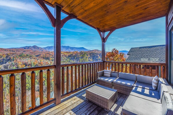 Kommen Sie nach Hause in unsere neu renovierte 3-stöckige, 2500 Quadratmeter große 4 Schlafzimmer 4. 5 Bäder Moderne Bauernhaushütte in Gatlinburg Falls Parkview - Up the Ante TN. Sie erreichen unser Haus bequem vom Parkway aus mit einer kurzen 3-minütigen Fahrt auf vollständig asphaltierten Straßen ohne steile Hügel. Komfortabel für 12 Personen in unserem elegant gestalteten Haus, in dem jedes Schlafzimmer ein Meister ist - jedes mit einem eigenen Bad! Genießen Sie friedlich den Panoramablick auf die Smoky-Berge vom Oberdeck in unserem Wohnzimmer-Schnittsofa im Freien oder in einem von 2 Schaukelstühlen. Genießen Sie ein entspannendes Bad in unserem 7-Personen-Whirlpool auf dem Deck unten, während Sie die Smokies in ihrer ganzen Pracht überblicken.