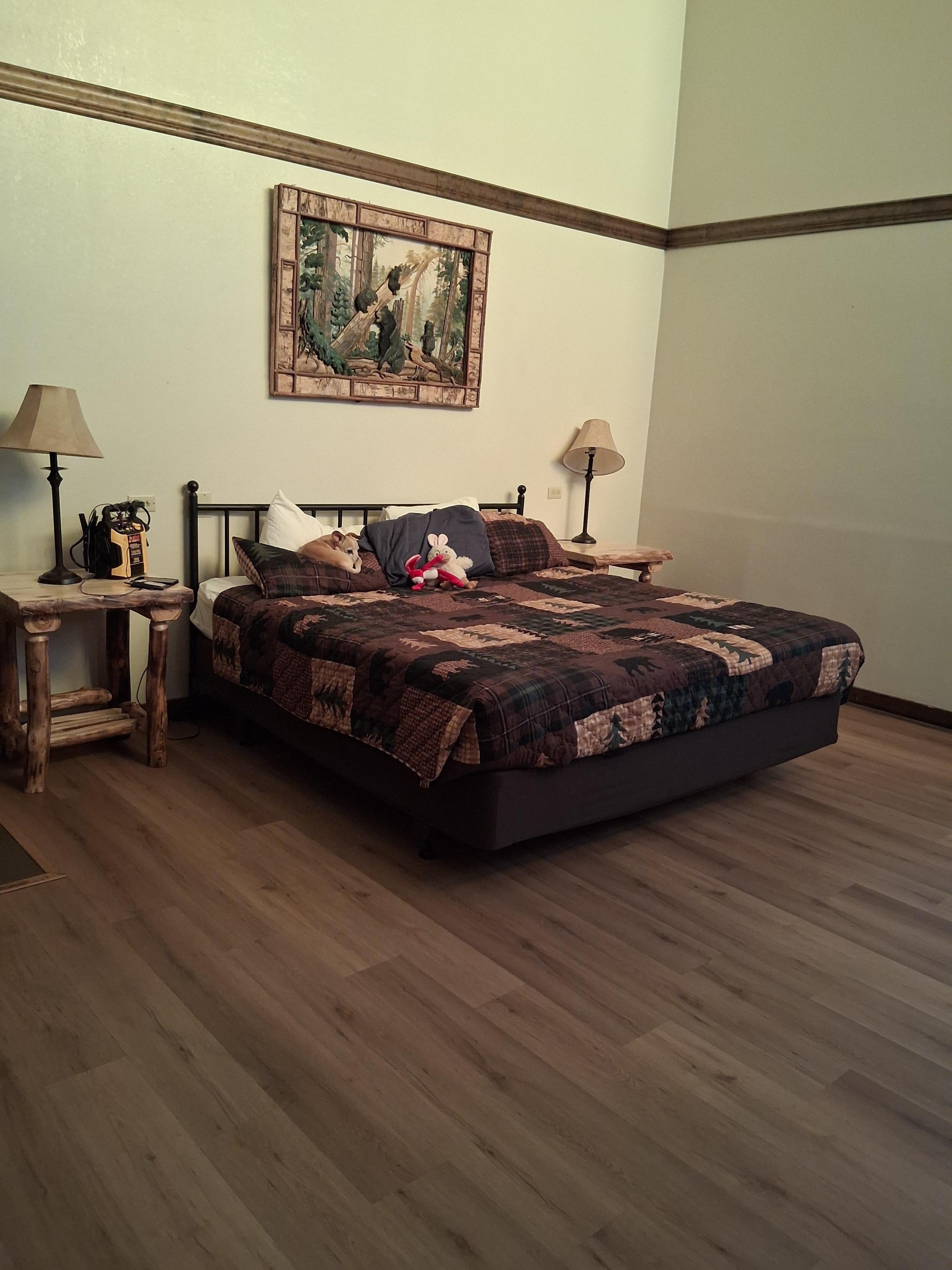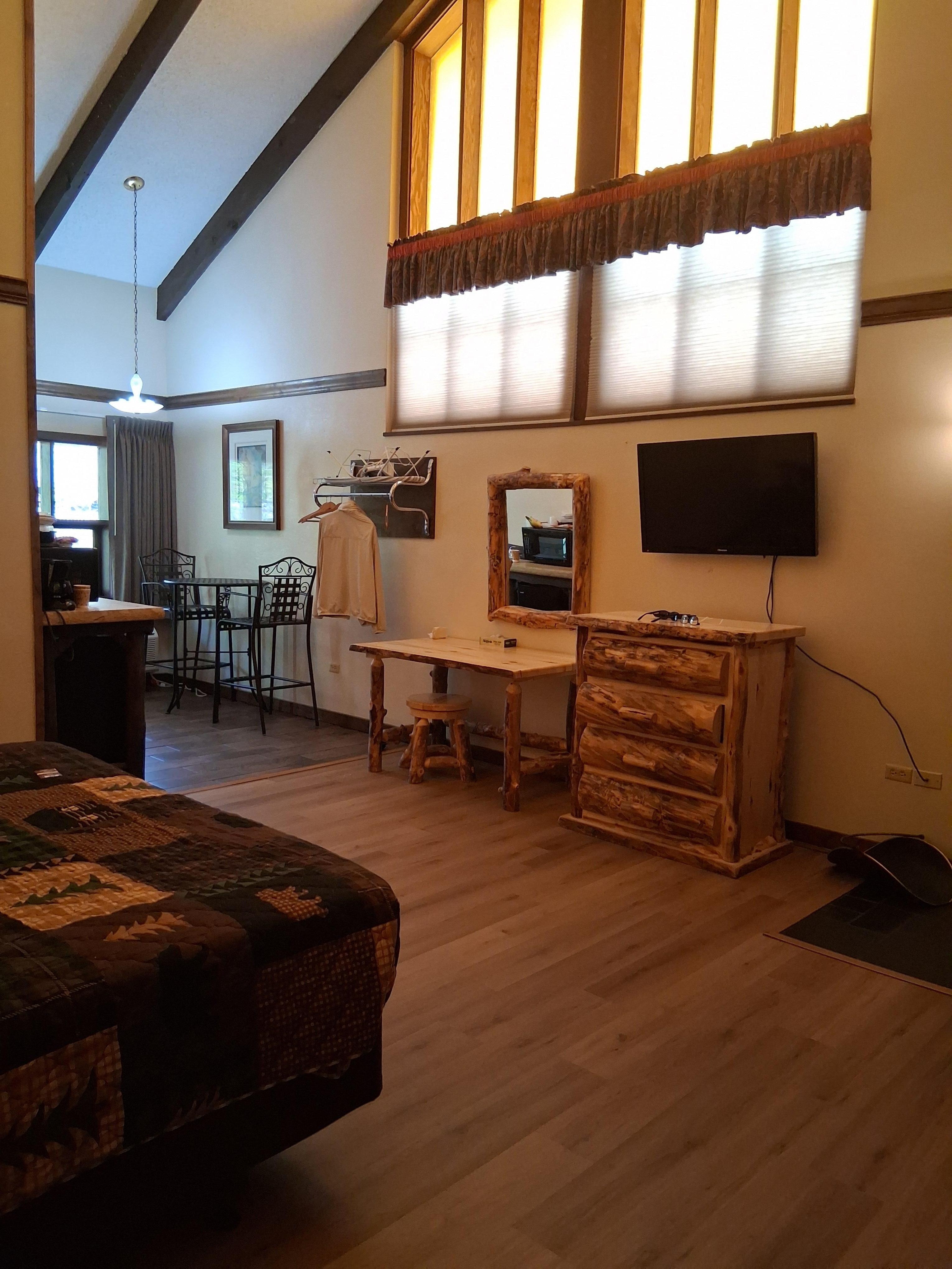 Ok, for starters, we all know the online photos are meant to make the properties look better than they are, but the rooms were not even close to what was online. The rooms were to give the log cabin feel, but only putting up some log design dressers and a comforter with trees on it, doesn’t automatically create that theme, but that’s not the worst to point out. The property clearly was not a part of the original grounds and was a shady, motel adjacent that was lazily fixed up to match. Now for the major issues. Bed sheet had dried stains on it, that could only be assumed to be blood, the floor was absolutely disgusting, leaving dirt on your soles if walking barefoot, and the toilet would not flush, only drain slowly with no plunger to try and fix the pipe clog. Stay at your own risk!