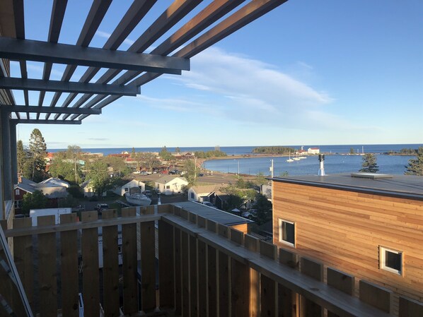 Voici un bref tour de la propriété et de la Sky House: Commencez par conduire au coeur du Grand Marais par le port. Tourner à gauche sur la colline 1/2 bloc. Tirez dans le parking juste à l'extérieur du gîte. Montez jusqu’à l’entrée et passez sous l’arc nordique jusqu’au premier des 3 ponts où vous pourrez ranger vos vélos en été. Une fois à l’intérieur, vous aurez suffisamment d’espace pour vous débarrasser de la neige, suspendre les manteaux et poser les skis des raquettes. Descendez l’escalier de marque de David Salmela: un demi-vol jusqu’à la première chambre. Sur le chemin, vous trouverez de nombreux placards, une salle de bain et votre chambre à coucher avec armoires intégrées, bureau et sortie vers votre propre patio privé en pierre bleue. Les sols sont chauffés. Pour la deuxième chambre, dirigez-vous vers l'entrée, les armoires encastrées, la deuxième salle de bain, la chambre avec son placard éclairé et son bureau de planification, ainsi que votre propre balcon enveloppant. Chaque chambre est séparée par un sol traité insonorisé pour une intimité maximale. Poursuivre l'escalier inspirant vous mène à la zone de rassemblement primaire au dernier étage. En chemin, vous remarquerez des sculptures et des œuvres d'art produites localement, décrites dans le guide sur la table. Cette région est à couper le souffle avec ses grandes fenêtres, sa vue sur la ville et le port, le lac Supérieur et les terrains privés. Il y a une cuisine entièrement moderne et capable, un architecte conçu construit dans un canapé et une cheminée à gaz contemporaine. Le canapé peut accueillir deux dormeurs simples. Notez le puits de lumière unique avec les traitements modernes de la boîte à lumière et le téléviseur pop-up à bouton-poussoir électronique que vous pouvez laisser caché si vous le souhaitez. Il y a aussi un pont enveloppant à ce niveau supérieur avec une vue fantastique sur les toits, le port, la ville et bien sûr le lac Supérieur. C'est l'une des plus belles vues sur le lac Supérieur sur toute la côte nord. La maison entière a des sols en ardoise et des armoires modernes. Il y a une buanderie avec laveuse et sécheuse. Tout à propos de la Sky House est conçu en tenant compte de la durabilité environnementale. Ces maisons ont une empreinte incroyablement faible à la fois structurellement et écologiquement. Les fondations ont été conçues pour occuper le moins de terrain possible - en étant petites au début et en augmentant au fur et à mesure que vous montez, comme le vieux Stabur sur lequel repose ce design. L'efficacité énergétique est profonde car ils sont composés de panneaux structurellement isolés qui sont incroyablement efficaces. Aucun coût n'a été épargné pour faire de la Sky House la plus haute qualité, l'ajout architectural le plus significatif au magnifique paysage du Grand Marais. Nous espérons que vous le trouverez chaleureux, accueillant et unique dans l’un des endroits les plus magiques au monde.
