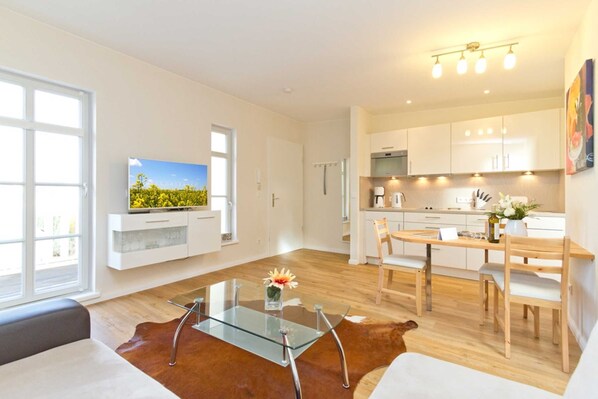 Freuen Sie sich auf einen gemütlichen Wohnraum inkl. Dachschrägen, einem großen Ecksofa, mit einem Essplatz sowie einer offenen Küchenzeile inkl. Backofen, Ceranfeld, Mikrowelle, Kühlschrank und Geschirrspüler. Der angrenzende Balkon lädt zu einem Frühstück unter freiem Himmel oder das Gläschen Wein am Abend ein.