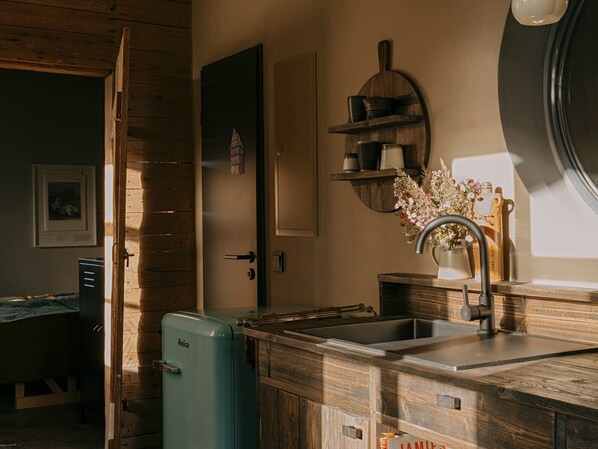 Vaisselle pour 4 personnes - ustensiles de cuisine - plaque de cuisson - réfrigérateur - cafetière expresso - bouilloire