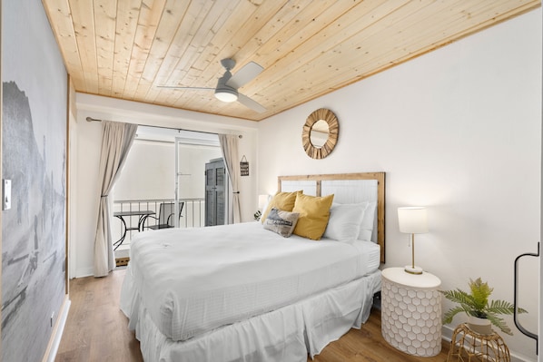 Schlafgelegenheiten sind bequem mit einem Kingsize-Bett im Schlafzimmer und einem ausziehbaren Tagesbett im Wohnzimmer, das zwei Doppelmatratzen hat. Diese Wohnung hat keine Tür, um das Schlafzimmer vom Wohnzimmer zu trennen.