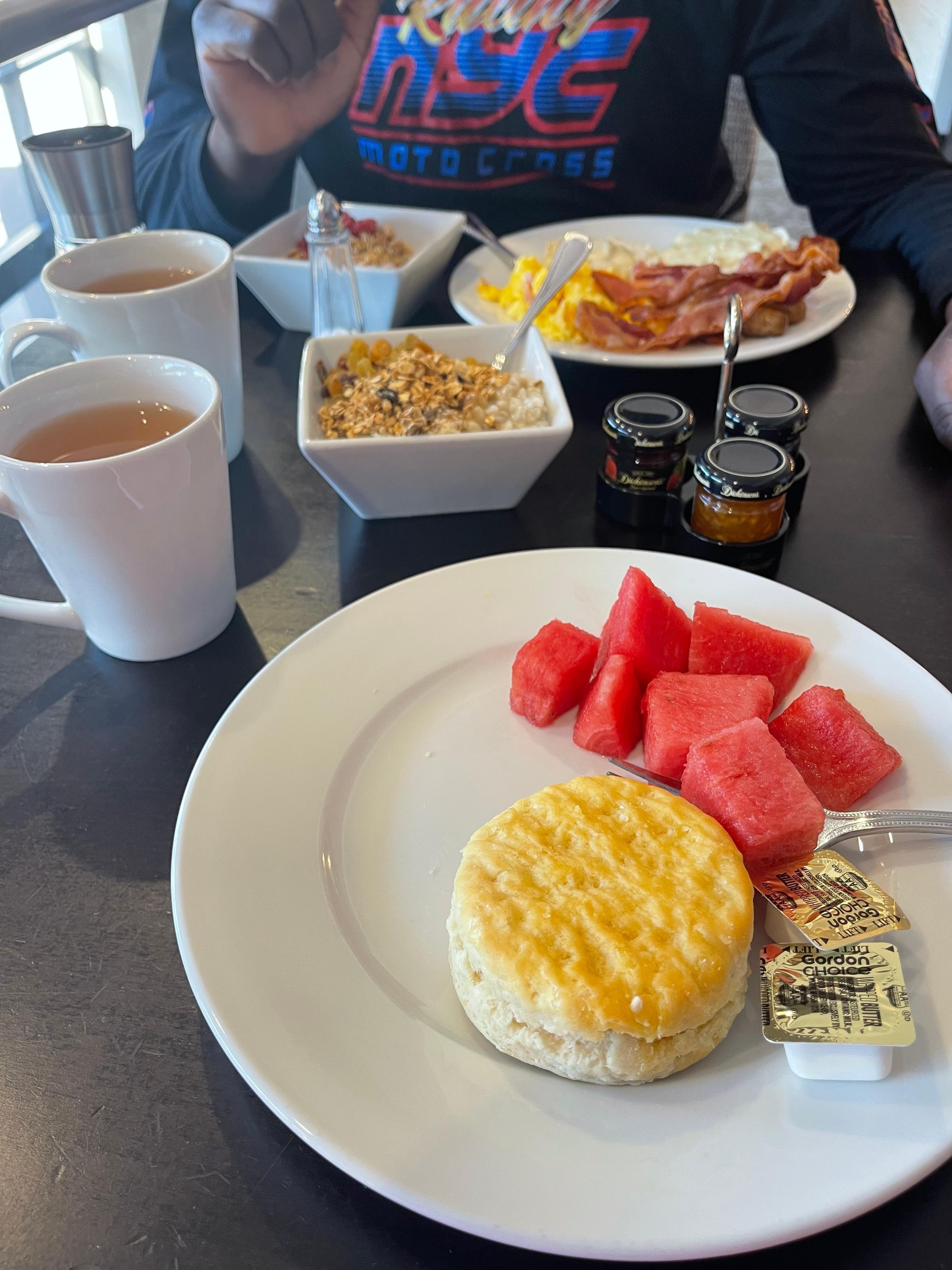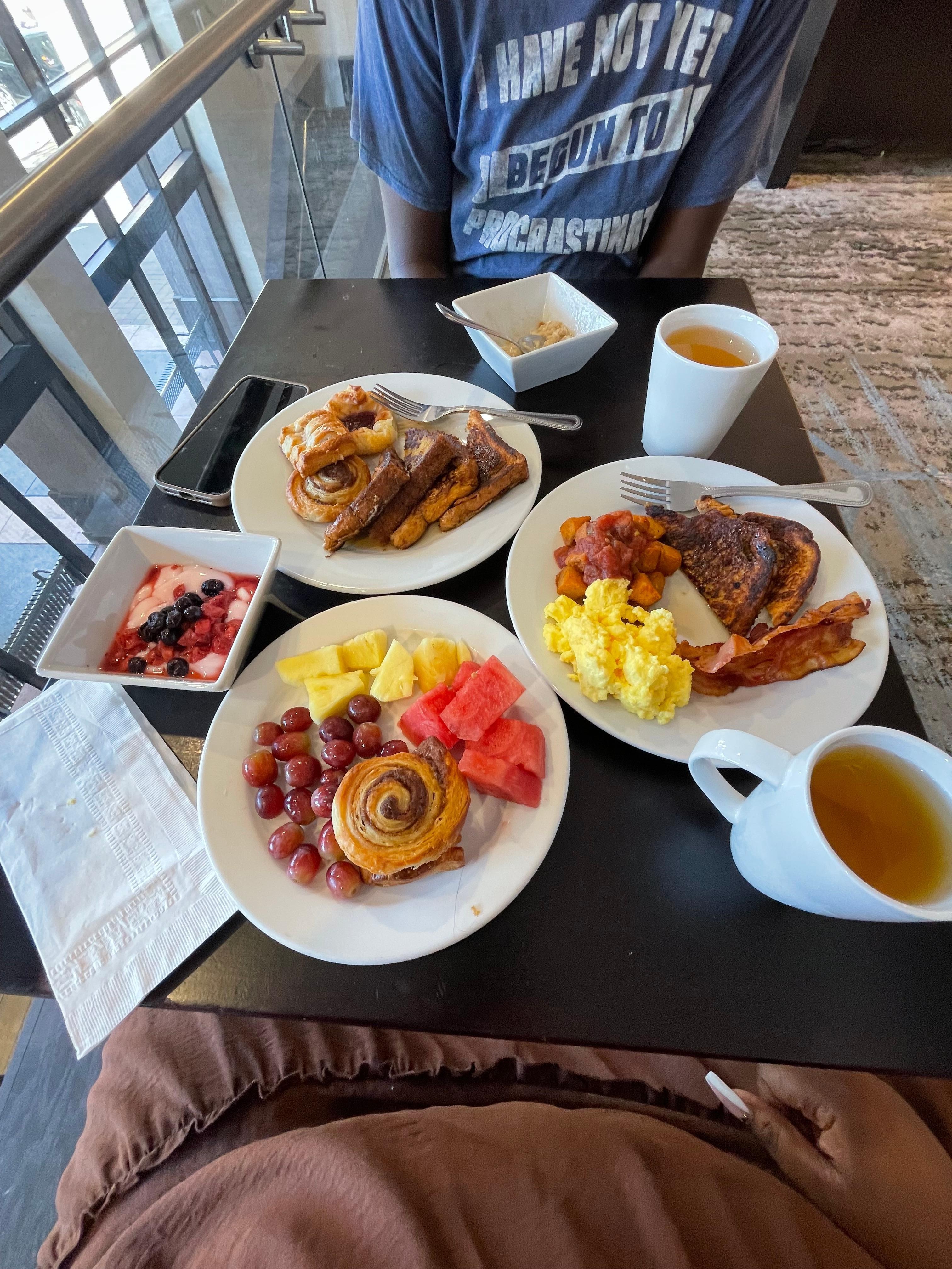 Our stay was great at first. the hotel was clean, friendly staff, very attentive as well, and very accommodating. Unfortunately, we had to frequently ask for house keeping to come then after we’d ask the second or third time they’d finally come at almost night time. We tried to stay out of the room so they could and we’d also take our dog with us so she would t bother them. We had her kennel in the room in case we left her, but we never did. They had the audacity to come in our room and not clean the room, but leave the linen on the dining room table. According to them the reasoning for that was because our dog was in there (which was a lie). How was she in the room when she was with us all day. Mind you we were there on our honeymoon. I personally wasn’t a fan of the breakfast. Everything looked appetizing, but it wasn’t for me at least. I didn’t get around to trying the restaurant, but I heard great things. The parking was fine, but limited. You definitely have to get there early.