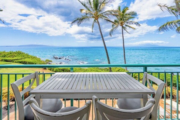 This corner unit has direct ocean views from two sides, and is very tastefully decorated with a beach vibe. Everything you’ll need is stocked in the kitchen and there are beach chairs and umbrellas as well. The laundry is a shared, coin-op laundry and the bedroom is on the street side of the condo which was sometimes noisy in the early mornings, especially on garbage day. But the coziness of the condo and the incredible location, steps from the beach, made it a place we’d definitely return to!