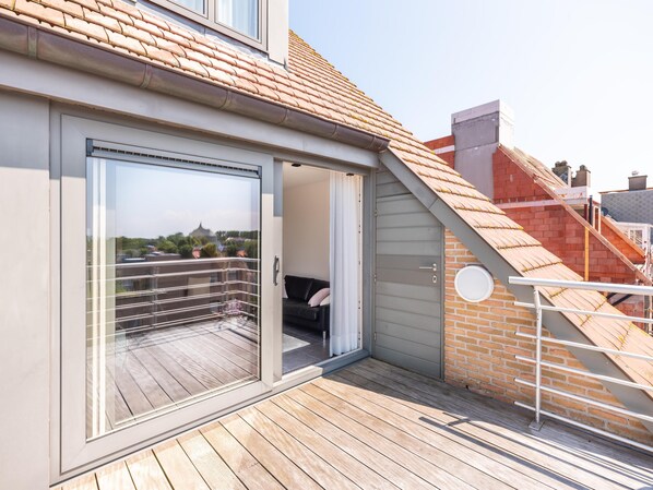 Au 4ème étage: Salle de séjour avec TV(écran plat, digital), coin salon , salle à manger avec table , cuisine ouverte avec plaque de cuisson(vitrocéramique), bouilloire, grille-pain, hotte, cafetière(filtre), four(électrique), grill, micro ondes, lave-vaisselle , réfrigérateur(+ congélateur), Mixeur à main , WC avec WC , aspirateur, 2x terrasse(privé), mobilier de jardin, 2x chaises longues