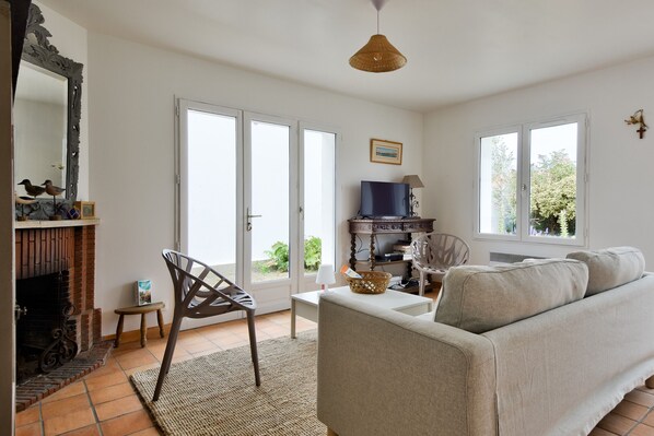 Dès l’entrée, vous serez séduits par la pièce de vie traversante, baignée de lumière naturelle. Elle se compose d’un salon confortable avec canapé, télévision et grandes baies vitrées donnant sur le jardin, parfait pour vos moments de détente ou vos apéros après plage. La salle à manger attenante permet de partager vos repas en toute convivialité, et la cuisine ouverte entièrement équipée ravira les cuisiniers : plaques de cuisson vitrocéramiques, réfrigérateur, micro-ondes, four, congélateur, lave-vaisselle, cafetière Nespresso, grille-pain, bouilloire… Tout y est pour cuisiner comme à la maison !