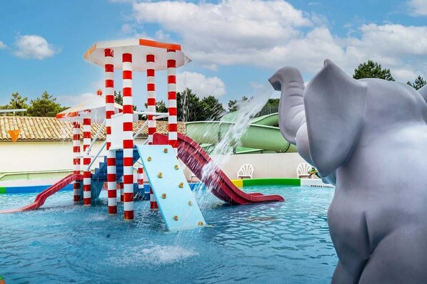L'espace aquatique avec sa piscine extérieure chauffée, ses toboggans