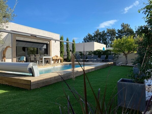 D’un jardin de 342 m² : salon de jardin, chaises longues, plancha, piscine de 7x3 chauffée, en eau salée avec système de sécurité au norme.