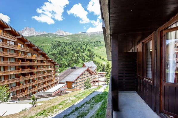 À 20m des pistes de ski, 2ème étage, vue montagne, balcon, parking, télévision, casier à ski, 19m²